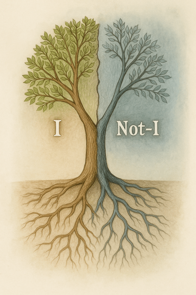Ordinary perception is divided into two. The German philosopher Fichte describes this division as between the Ich (I) and Nicht-Ich (not I). This “I” part of the perception includes all of our ideas about who we are, who other people are, and how the world is supposed to be. The “not I” is perceived as the outside world which tends to be seen as in opposition. In fact, the sense of “I” can only exist by differentiating itself from the “not I” There is a conflict inherent in this way of perceiving as the I tries to dominate, escape, or resist the not-I. Liberation from this conflict arises by recognizing that the division in perception is a delusion.